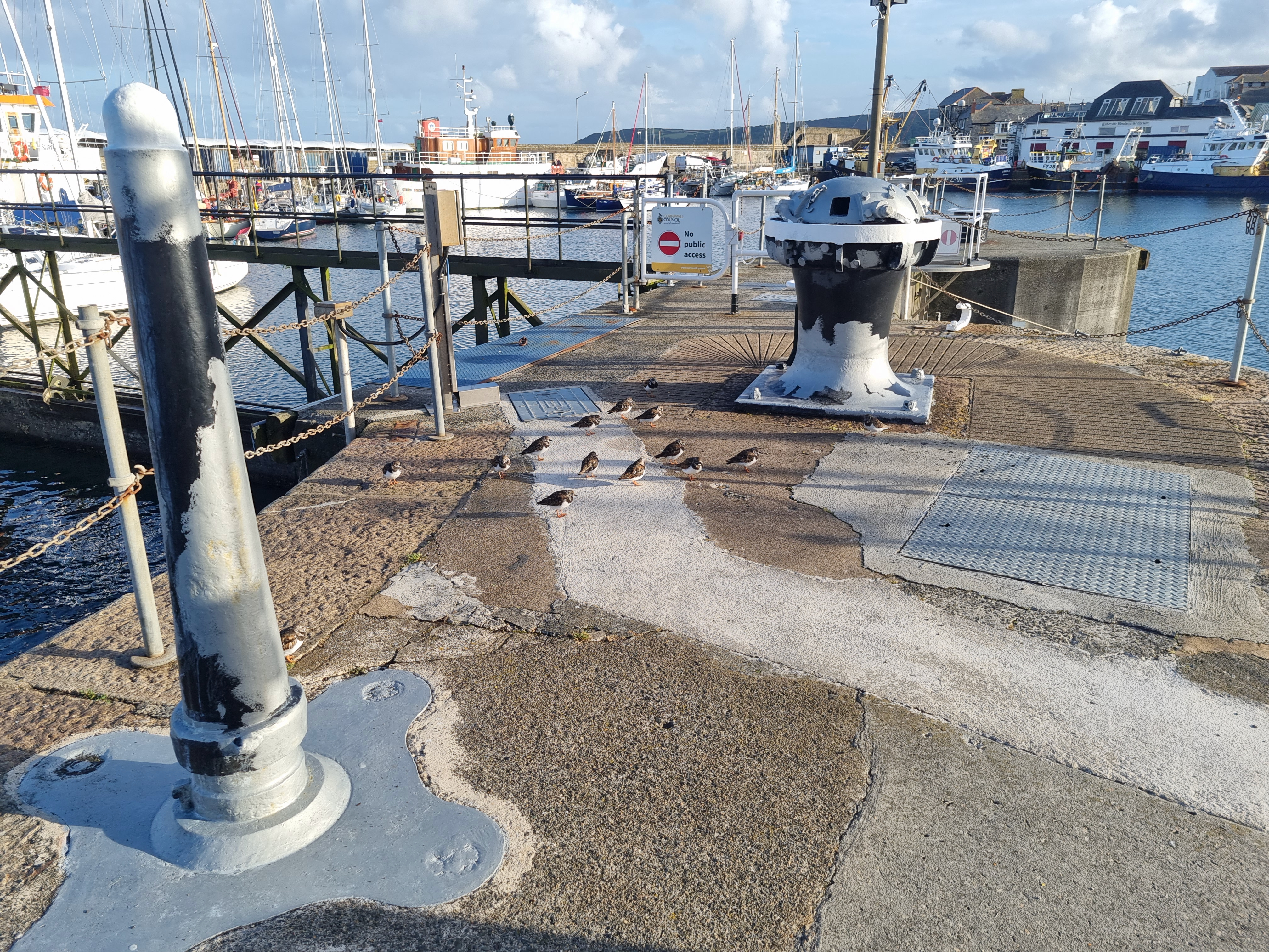 | zondag 7 juli 2024 | Richting ScillyVanmorgen op tijd vertrokken uit Penzance op weg naar de Scilly's. Was een lastige tocht: tegen de wind in kruizen. Kwam verkeerd uit bij de TSS, daar flink wat tijd verloren. Vervolgens vlak bij de Scilly's het tij tegen. Toen maar besloten om richting Ierland te gaan. Foto is uit de haven van Penzance, een groepje Steenlopers hing als volleerde hangjongeren rond bij de sluis. |