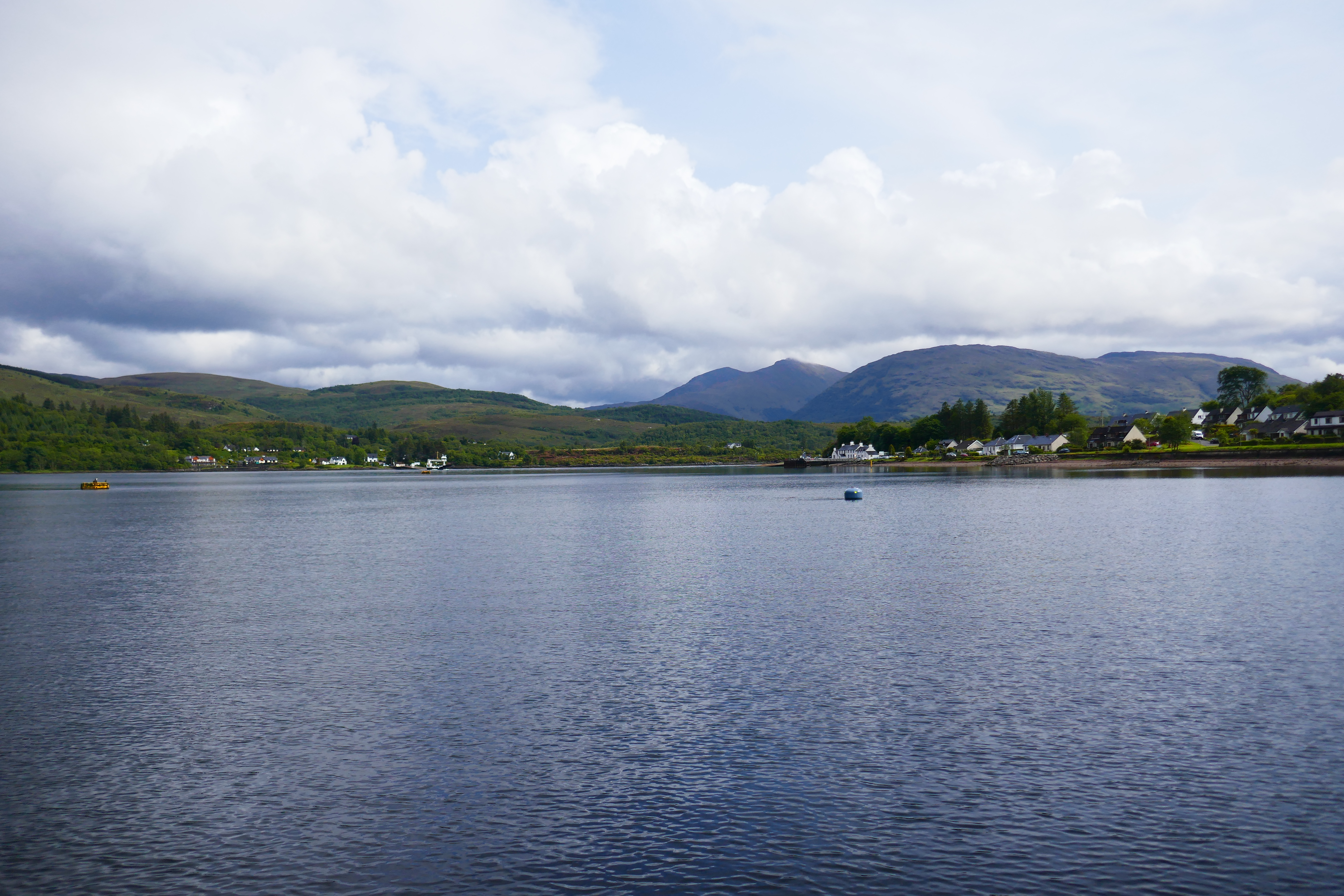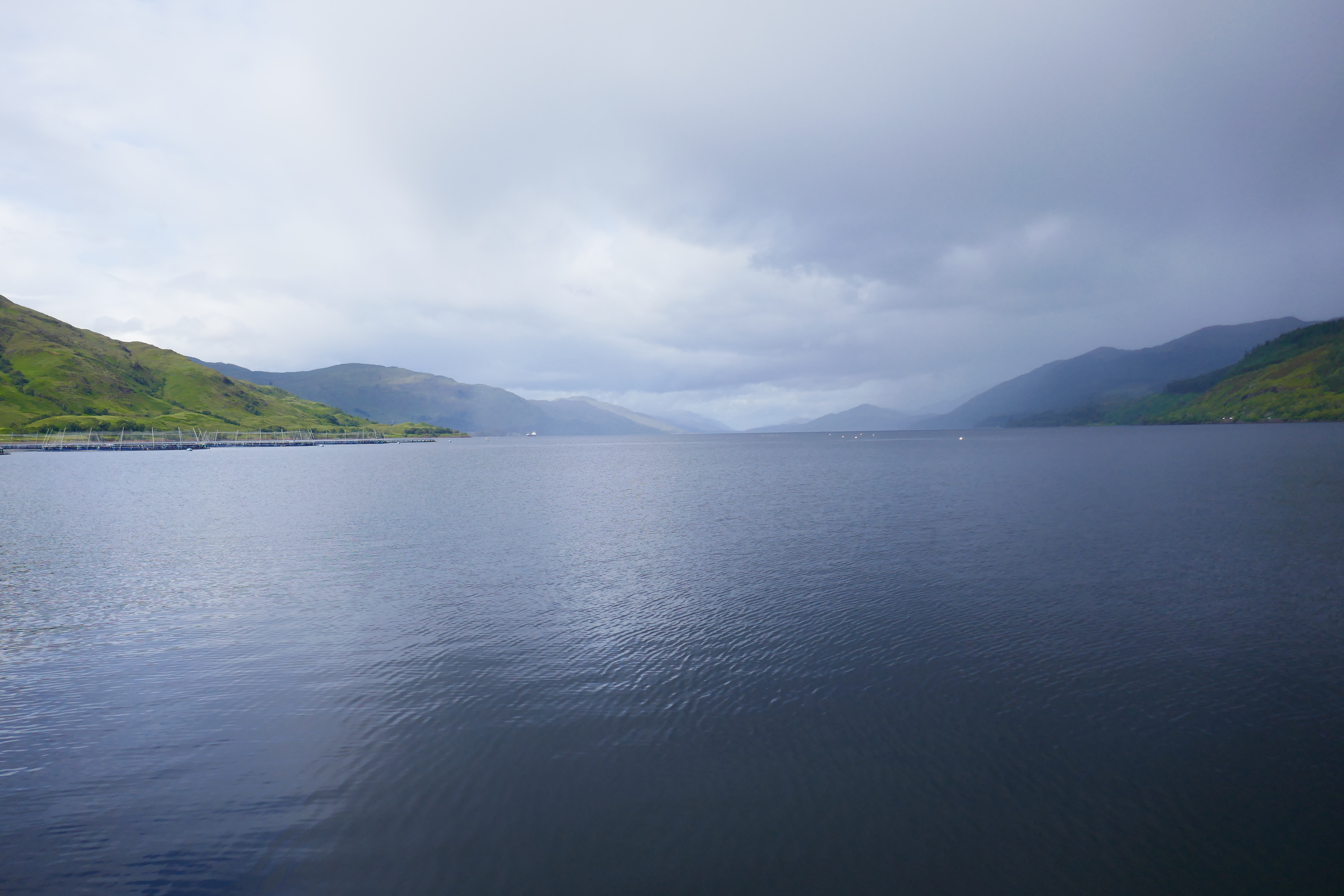 Foto van Loch Linnhe richting Fort William, met de fishfarm (links).